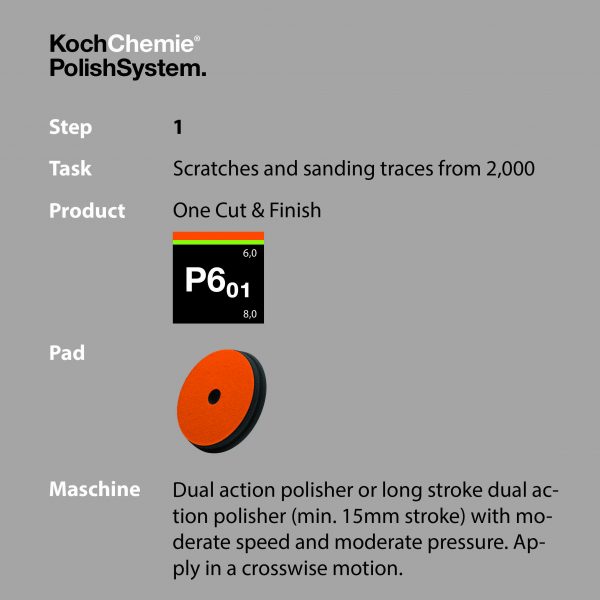 Here, too, we follow the system concept: The orange One Cut Pad with its reticulation and cell count is optimally matched to the One Cut & Finish P6.01. As usual, this is available in the usual three sizes (Ø 76 mm / 3″, Ø 126 mm / 5″, Ø 150 mm / 6″) Polishing compound and pad complement each other perfectly to quickly create a high-gloss surface. In just one step, scratches and sanding traces from P2000 grit upwards are effectively removed and the surface is simultaneously sealed by the Carnauba waxes contained in the polish.